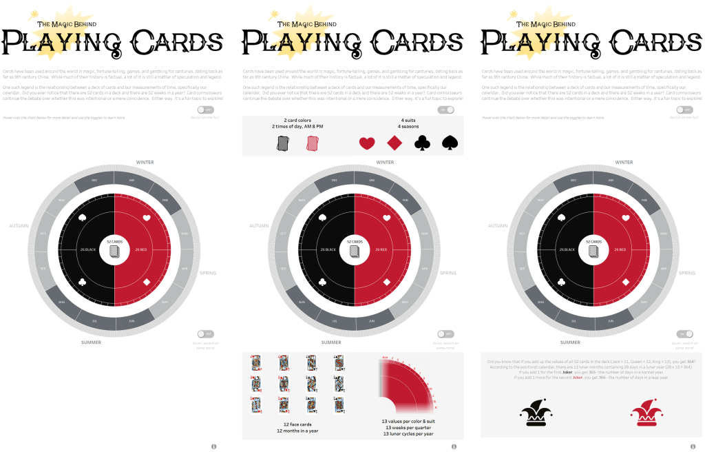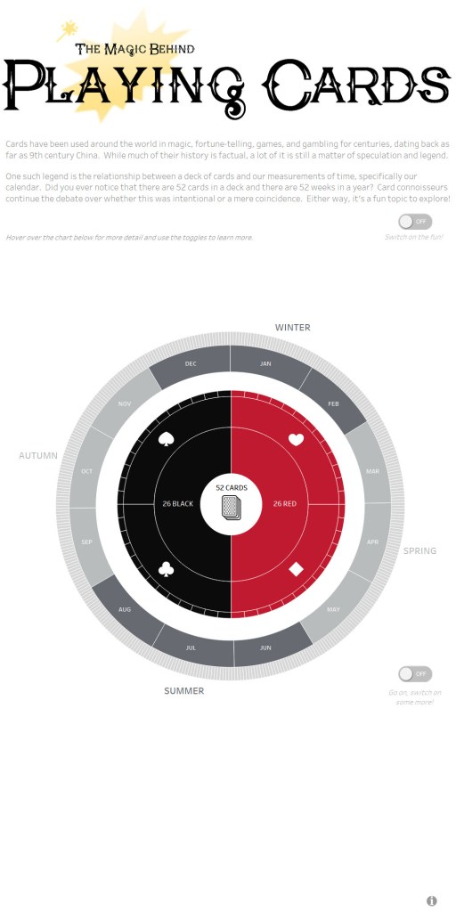 There’s so much going on with a deck of cards beyond the similarities with our calendar – theories about what the suits represent, what or who specific cards represent, the list goes on. But for this viz I decided to stick to the calendar similarities since there’s plenty there to work with and at the same time not be TMI.