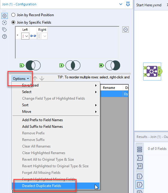 ► Remove things (columns) you don’t need. You can use the Select Tool to de-select items, or (a new tip for me!) in the Join Tool you can click Options > Deselect Duplicate Fields and it will un-tick, for example, any items where you’re doubled up on, such as anything prefixed with Right_ or Left_, depending on the join you made. This will make things much cleaner and understandable further downstream.