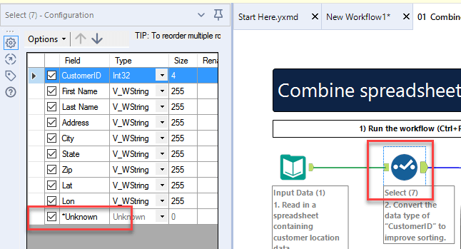 ► I never paid much attention to the ‘Unknown’ box when using the Select Tool, but I will now. This is for a situation where a new column shows up in your data unexpectedly. It seems that a lot of the time whether it’s ticked or not, there will be zero impact to your workflow results (which is why I personally haven’t noticed it much). But if you are connecting to a database and changes have been made to it that you weren’t aware of and this is ticked, you could potentially be bringing in columns that may affect your workflow results and analysis – so it’s definitely something to consider for your own situation. Here is a community post on this topic.