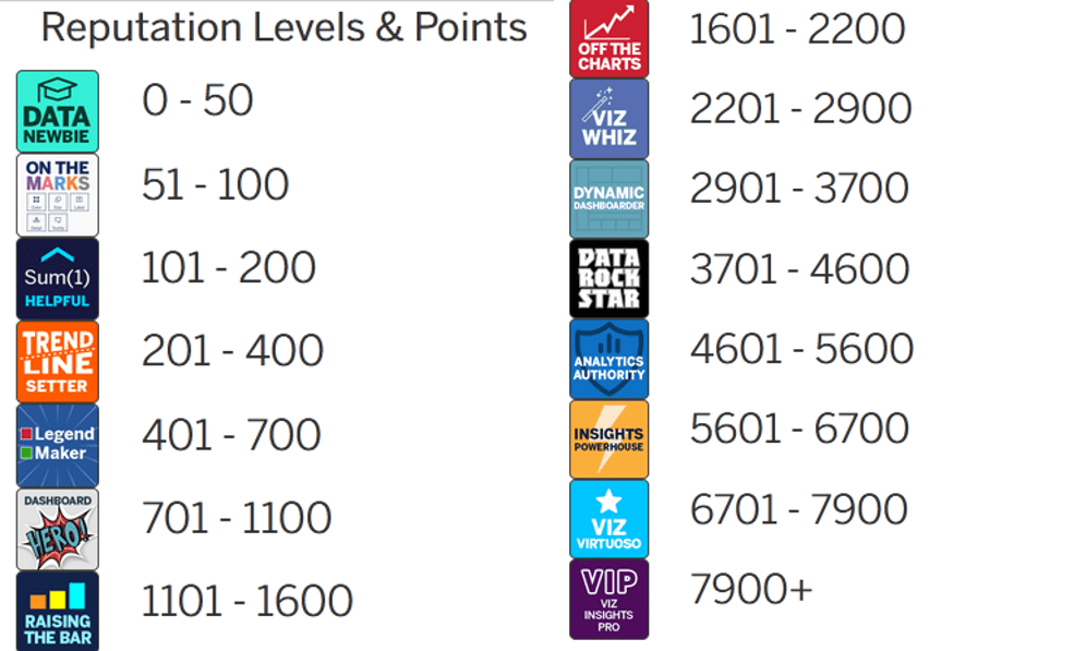 Perhaps you’d like to see your own name on the Tableau Community Forums Leaderboard some day! Your reputation on the Community Forums directly corresponds to how active you are. The more you engage through posts, comments, and shares, the higher your reputation will be. You earn a different number of points depending on how you engage.